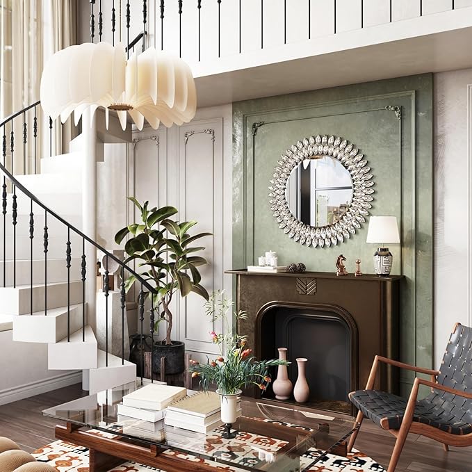 Kelly Miller Round Jeweled Mirror for Wall Decor, 26 in Modern Decorative Wall Mirror with Luxury Diamonds Beveled Vanity Mirror for Bedroom Dresser, Living Room Table, Bathroom, Hallway, Entryway