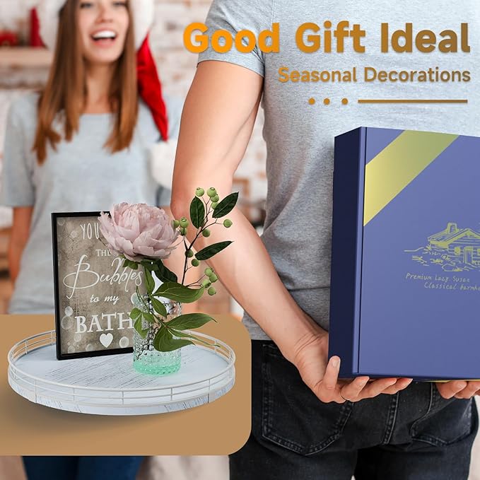 13" Oak Bathroom Vanity Tray Turntable for Perfume Candle, Round Wooden Decorative Tray for Kitchen Sink Countertop Organizer, Bathroom Counter Organizer for Skincare Makeup, Rustic White