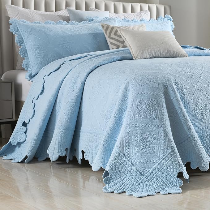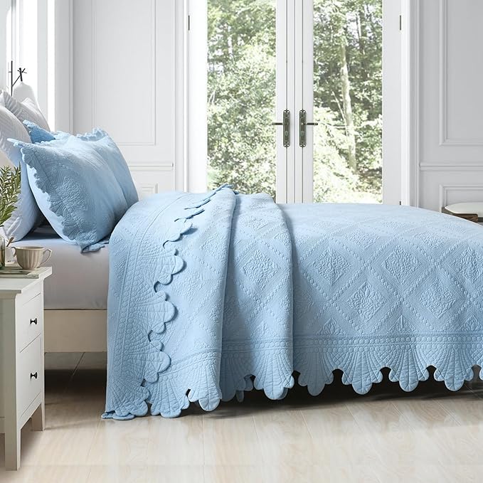 MarCielo 3-Piece 100% Cotton Oversized Bedspread Lightweight Quilt Coverlet Embroidery Farmhouse Bedding Set (TK Light Blue, Oversized King (118"x106"))
