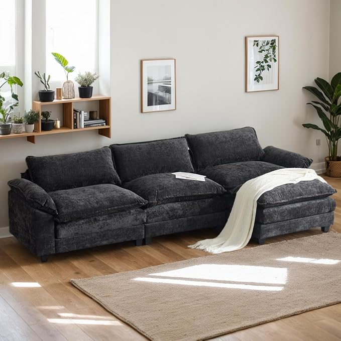 Karl home Sectional Sofa Modular Deep Seat Sofa Couch with Ottoman, Chenille Sofa Sleeper Comfy Upholstered Furniture for Living Room, Apartment, Studio, Office, (3-Seat & 1-Ottoman, Black)