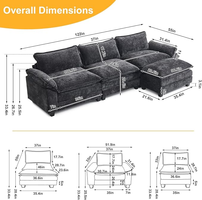 - Stunning Comfortable Couch - This oversized couch features upholstered 2-layer seat cushions with high-resiliency foam, thick removable armrests, and a 24" deep seat, which provides a cloudy seating experience.