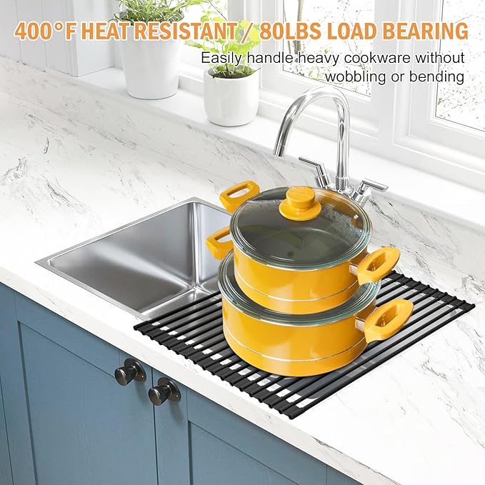 - Space Saving and Folable Design: Save your counter space by placing it over the sink to put your dishes, bottles, cups, pots., etc. It is foldable and can be rolled up for easy storage. A great life gadget as kitchen sink organizer and apartment must haves.