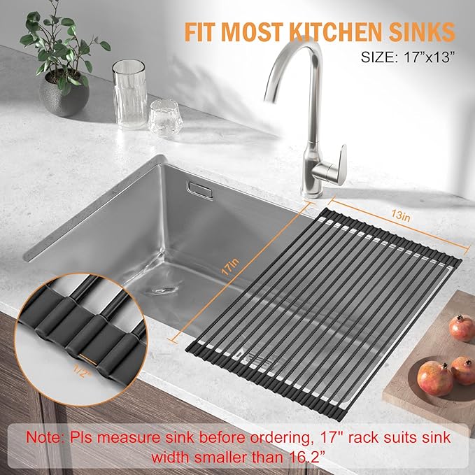 - Perfect Size for Most US Sinks: 17" Length is compatible for sink LESS THAN 16.2 inches width, provides an ideal fit for most US kitchen sinks. Easily wash and dry any kitchen pots, pans, dishes, etc. PLEASE MEASURE YOUR SINK SIZE BEFORE PURCHASING.