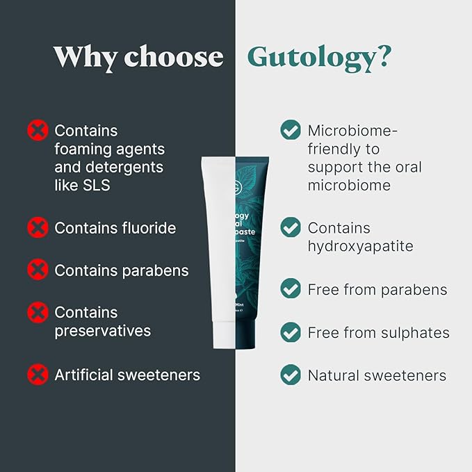 - Natural Alternative - Ditch toxic detergents found in mainstream toothpaste brands and switch to Gutology's 100% natural formulation. Prioritise oral microbiome health by choosing a toothpaste free from microbiome-disrupting ingredients commonly found in mainstream toothpastes.