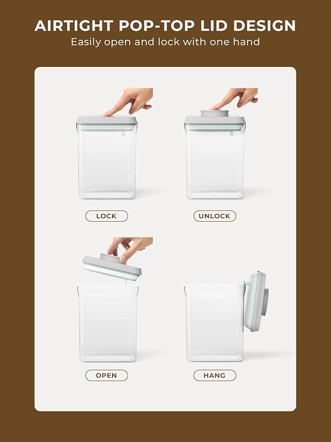 - Convenient One-button Lid: Easily open and close the air tight cereal storage containers with a single button press. Keep your food fresh and bug-free with leakproof lids.