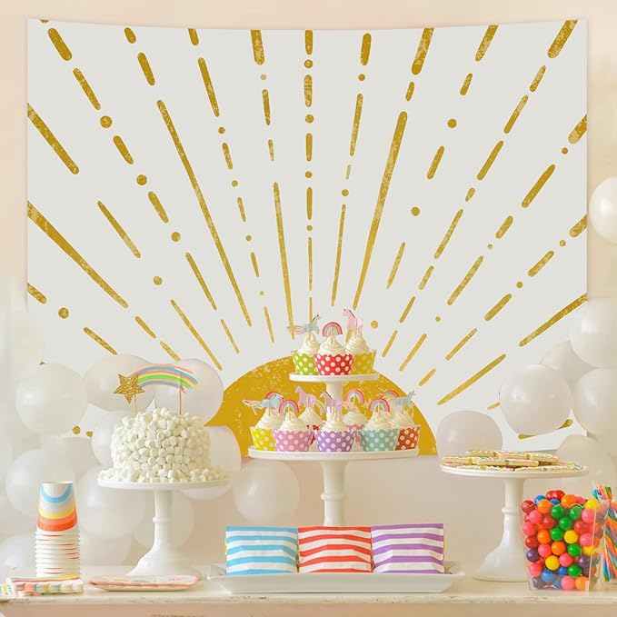 Kanuyee Gold Boho Burning Sun Tapestry Wall Hanging, Retro 70s Abstract Vintage Geometric Line Sunrise Tapestries for Bedroom Living Room Backdrop 44×60 inch