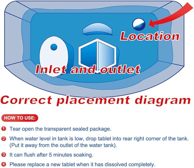 - EASY TO USE: Simply take one blue toilet tablet out of the box and place it in the toilet tank. Then, let it fully dissolve for at least 20 minutes until the water turns blue before flushing. (Please note, do not remove the water-soluble blue protective film) It will not cause any damage to the inside of the septic tank and toilet tank