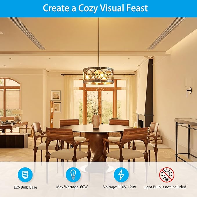 - [BULBS AND DIMMABLE]: Works well with LED, CFL, halogen, or incandescent bulbs, this vintage chandelier uses up to three 60W, E26 base bulbs. It works with dimmable bulbs and switches (bulbs and switches not included) and supports various bulb types, including S14, T45, A19, A15, and G16.5. The bulbs you choose can create different lighting effects, giving you the freedom to set the ambiance you desire.