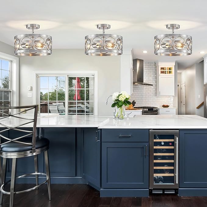 XINGQI Nickel Ceiling Light Adjustable Height Pendant Lighting Fixture 3-Light Metal Lamp 13" Rustic Round Lights for Dining Room Kitchen Bedroom Foyer Hallway