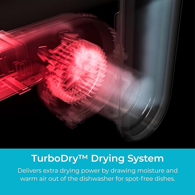 - TurboDry for Dry Dishes: A built-in fan pulls moisture and warm air out of the dishwasher while a heating element boosts drying power. Even plastics come out dry and spot-free. Ditch the dish towel