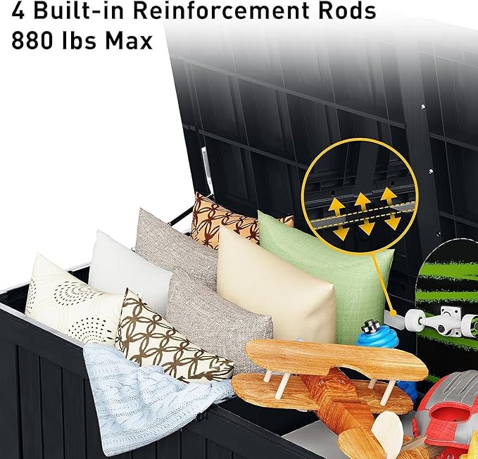 - ROBUST AND RELIABLE DESIGN - Engineered for heavy-duty use, this deck box can support up to 900 lbs, thanks to its reinforced metal rods and internal supports. Its thicker (0.08'') panels and precise assembly ensure superior stability and prevent warping or deformation over time.