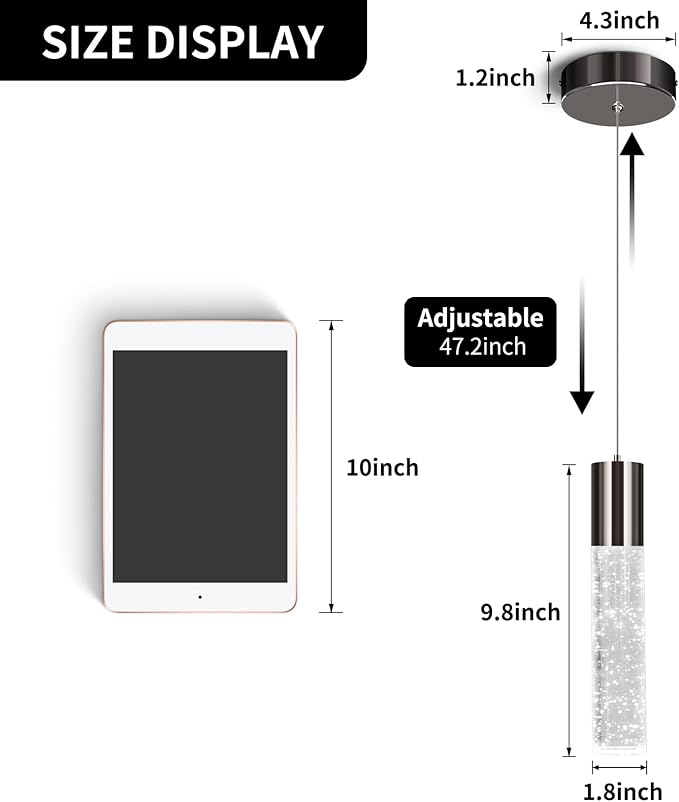 - 【Size and dimmable】: Kitchen island pendant light cylindrical body diameter: 4.6 cm, height: 24.9 cm. The height can be adjusted from 24.93 cm to 119.9 cm. Pendant light fixture with ETL certified dimming driver, the light brightness can be between 10%-100%, but needs to be used with a dimmer.