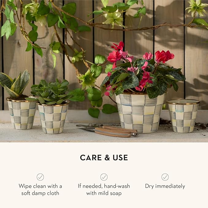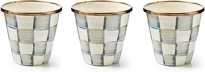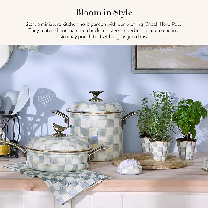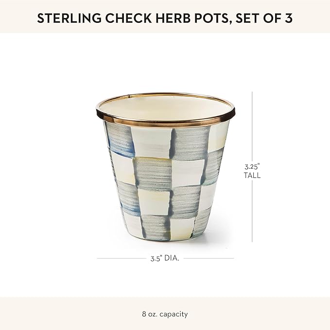 MACKENZIE-CHILDS Enamel Herb Pots, Small Plant Pots for Herbs or Flowers, Set of 3, Gray-and-White Sterling Check
