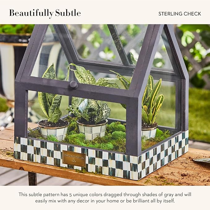 - INDOOR & OUTDOOR PLANTER POTS: This trio of petite Sterling Check Enamel Herb Pots is hand painted with subtle gray-and-white color-dragged checks. Presented in a woven sinamay pouch tied with a black grosgrain bow, this little kitchen herb-garden set even makes for a fun party favor!