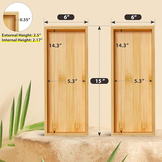- Luxury Bamboo Silverware Drawer Organizer - The silverware drawer organizer is made of bamboo, and the bottom are made from engineered wood board, which is more durable and sturdy than plastic. Each package comes with 2 piece bamboo drawer organizer, and the size of each drawer organizer is 15 x 6 x 2.5 inches. The bamboo drawer organizer certainly will help you store items and organize drawer in shelf/ closet/ cabinet/ dresser