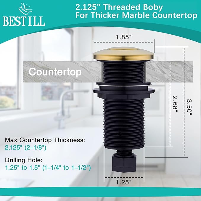 - EASY TO INSTALL - Garbage Disposal Switch Button can be easily mounted on any countertop or sinktop by drilling a 1-3/8-inch diameter hole. 3-inch thread plunger is not only for stainless steel sink top, but also for thick counter top like granite, marble, quartz, wooden and more.