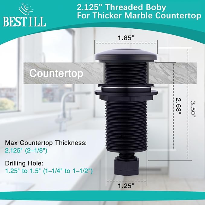 - EASY TO INSTALL - Garbage Disposal Switch Button can be easily mounted on any countertop or sinktop by drilling a 1-3/8-inch diameter hole. 3-inch thread plunger is not only for stainless steel sink top, but also for thick counter top like granite, marble, quartz, wooden and more.
