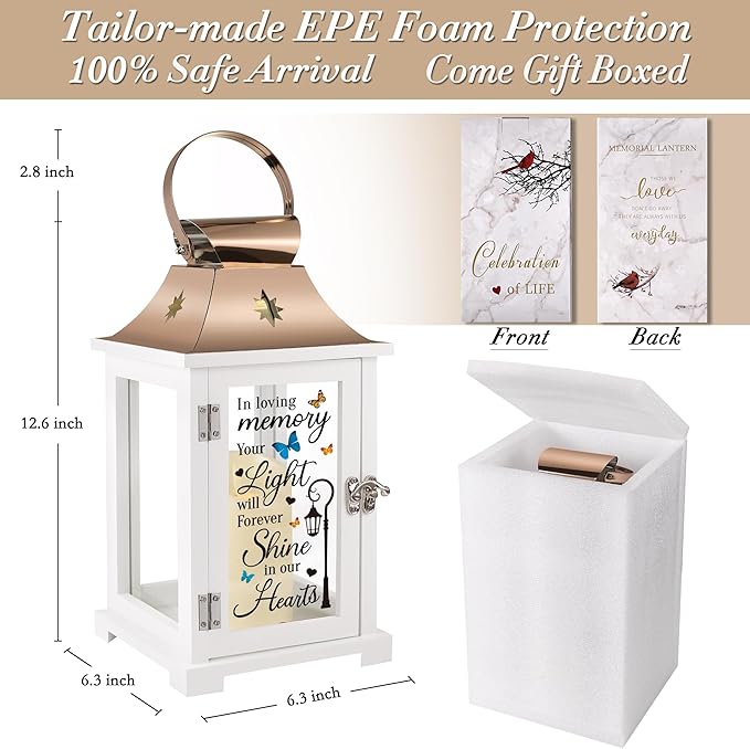 - Sympathy Gift-Well Packaged to Gifts: The sympathy lantern comes with an original designed gift box with inspirational words "celebration of life" & "those we love don't go away"&"always near". It's also protected by tailor-made EPE foam to make sure nothing is broken.This is a valued memorial gift that will be cherished for years to come.