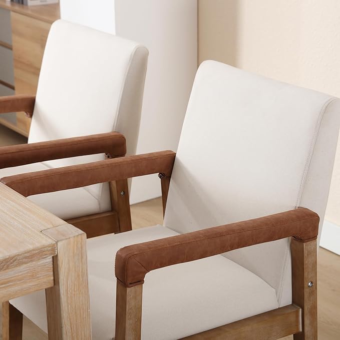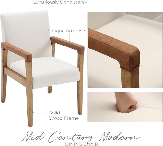 Mid Century Modern Dining Chairs Set of 2 Linen Fabric Upholstered Living Room Side Chair, Kitchen Arm Chair with Solid Wood Legs for Home Kitchen & Restaurant, Linen White