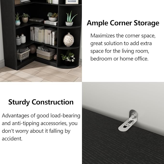 - 【High-caliber Quality & Sturdy Construction】This Loomie Black Corner Book Shelf is made from durable commercial grade laminate that will withstand all the daily stress that is thrown at it through the years, ensuring a consistent chic, minimalist look. Loomie Corner Book Shelf is a safe purchase when it comes to quality. Each shelf can hold up to 80 lbs. Anti-tipping kits, reinforced hardwares and full baffle improve the stability and security. You don't worry about it falling by accident. Overall, it will get the storage or display job done and look good doing it. It's a perfect size bookshelf for every home corner space.