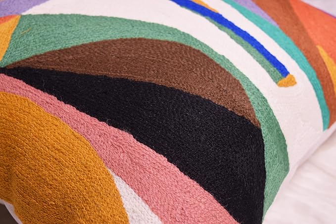 - ❤ Modern Throw Pillow Cover - Hand Embroidered: Our vibrant decorative pillow covers draw inspiration from Kandinsky's artistry and are meticulously hand-embroidered using soft wool. Our skilled artisans devote painstaking attention to detail, creating an extraordinary abstract pillow that enhances your home decor. An up-close look at this contemporary accent pillow reveals the exquisite craftsmanship of fine chain-stitch hand embroidery.