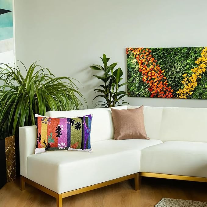 - ⤠Modern Throw Pillow Cover - Hand Embroidered: Our vibrant decorative pillow covers draw inspiration from Matisse's artistry and are meticulously hand-embroidered using soft wool. Our skilled artisans devote painstaking attention to detail, creating an extraordinary abstract pillow that enhances your home decor. An up-close look at this contemporary accent pillow reveals the exquisite craftsmanship of fine chain-stitch hand embroidery.