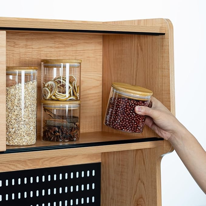 - [Thickened Glass jars] - Our glass storage jars are made of food grade borosilicate glass, BPA-free, hard and safe. Note: Our glass jars can be washed in the dishwasher or put in the refrigerator. We recommend removing the wooden lid before using it in the dishwasher and washing it by hand.
