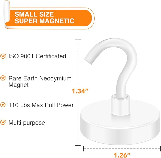- 【Premium Magnetic Hooks】- Ni+Cu+Ni Triple Layer nickel coating greatly reinforces corrosion resistance. The best coating available, which provides a shiny and rust resistant coated steel cup provides protection for the strong metal magnetic hooks and helps to prevent chipping or cracking, Safe to Use!