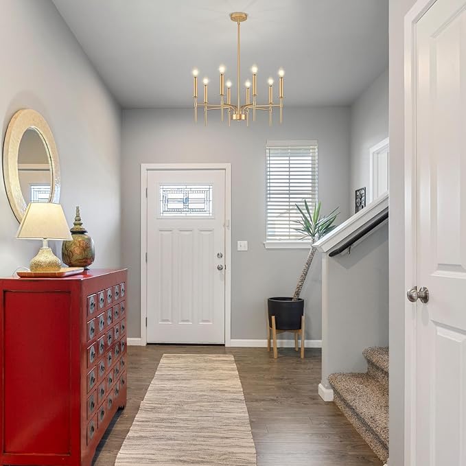 - Classic Farmhouse Chandelier: The ZUYURT 8-light gold chandelier merges classic candle-style elegance with a sleek champagne gold finish. Crafted from premium iron, this sturdy and stylish gold farmhouse chandelier is ideal for a dining room chandelier, or a centerpiece in your entryway modern chandelier for foyer