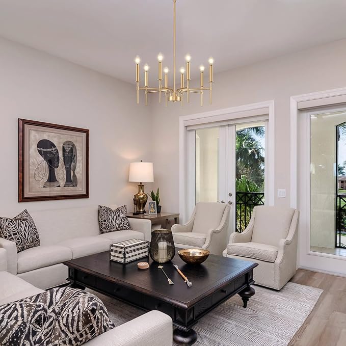 - Dimmable and E12 Bulb Compatibility: With 8 E12 candelabra sockets, this gold chandelier is compatible with various E12 bulbs (incandescent, LED, CFL, and halogen, 40W MAX / bulb), offering dimmable functionality to create the perfect ambiance. This gold matte chandelier allows for flexible lighting control, making it suitable as a gold chandeliers for dining room, or master bedroom chandelier (NOTE: bulbs and dimmer are NOT included)