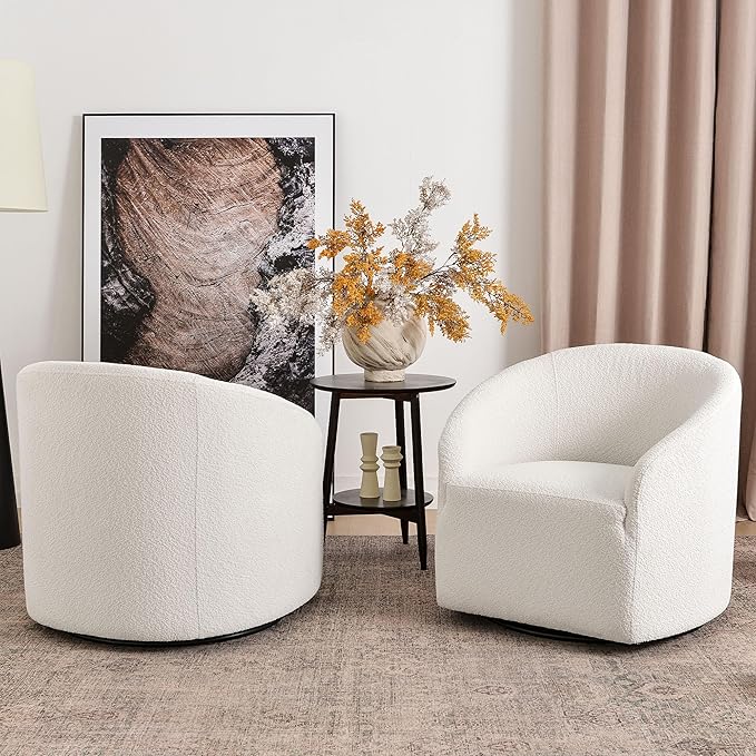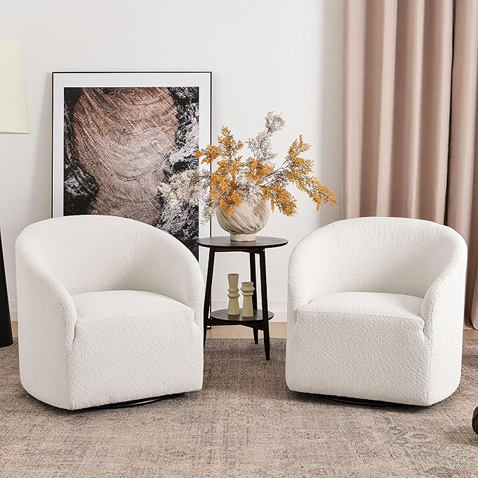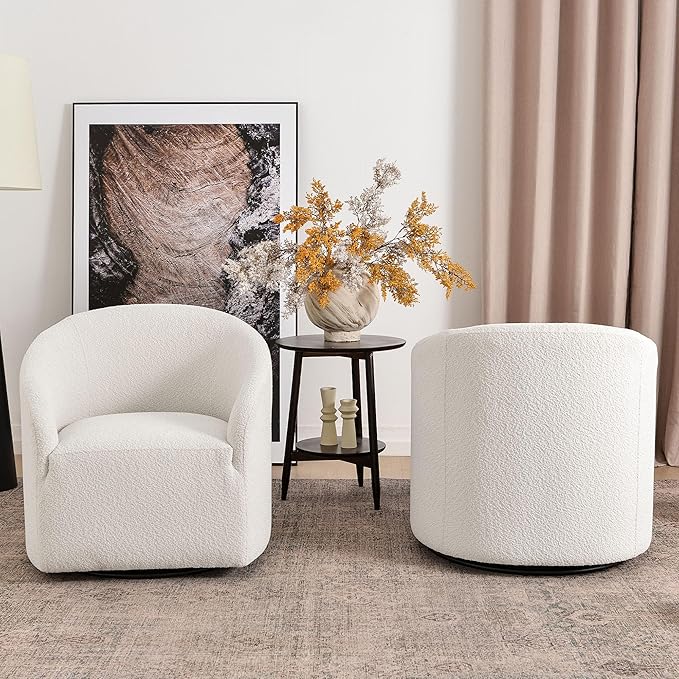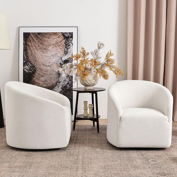 - SET OF 2 SWIVEL ACCENT CHAIRS: A set of two Swivel barrel chairs provides flexibility in terms of placement and usage. You can use them in various settings such as bedrooms, living rooms, and offices. They can be easily moved around and rearranged to suit your needs. Meanwhile, two chairs promote a more intimate and cozy setting, making it easier for people to engage in conversations. A pair of chairs can enhance the visual appeal of a room. They can serve as decorative elements, adding symmetry and balance to the overall design.