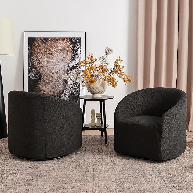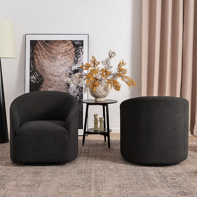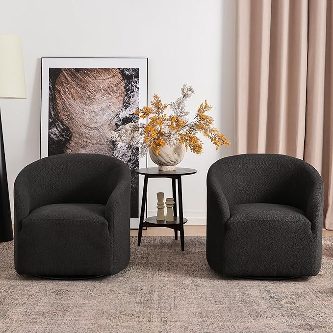 KINWELL 32" Wide Modern Boucle Swivel Barrel Chairs Set of 2, No Assembly Round Upholstered Swivel Accent Armchairs for Living Room, Bedroom (Black)