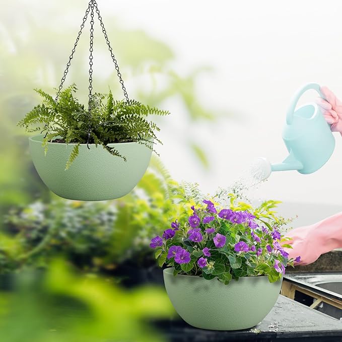 10 inch Hanging Planters for Outdoor Indoor Plants with Drainage Holes and Chain, 2 Pack Round Hanging Flower Pots for Garden Home Porch Decor,Green