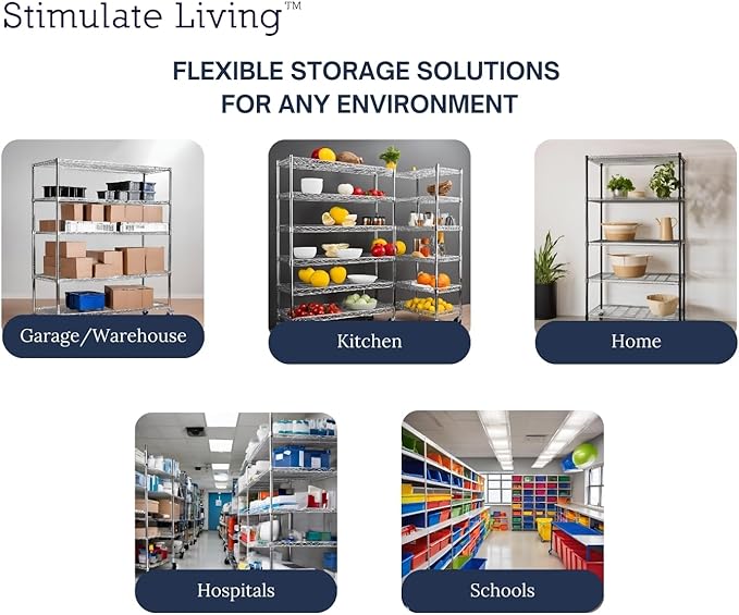 - ★FLEXIBLE USAGE★ Our Stimulate Living Wire Shelving is designed to be flexible and adaptable to a wide range of settings. It can be used in warehouses to store heavy equipment, in kitchens to hold cooking utensils, in garages to organize tools, in hospitals and laboratories to store medical supplies, in offices to keep files and documents, in retail stores to display merchandise, in restaurants to store kitchenware, in factories to hold raw materials, and more.