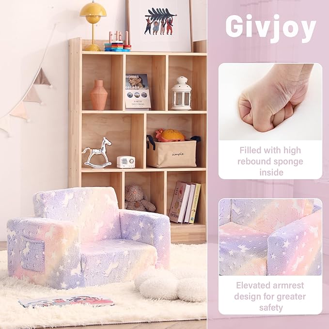 Toddler Chair Kids Couch, 2-in-1 Toddler Soft Sherpa Couch Fold Out Armchair with Removable Cover, Convertible Reading Chair Toddler Sofa for Kids, Glow in The Dark Purple Horse