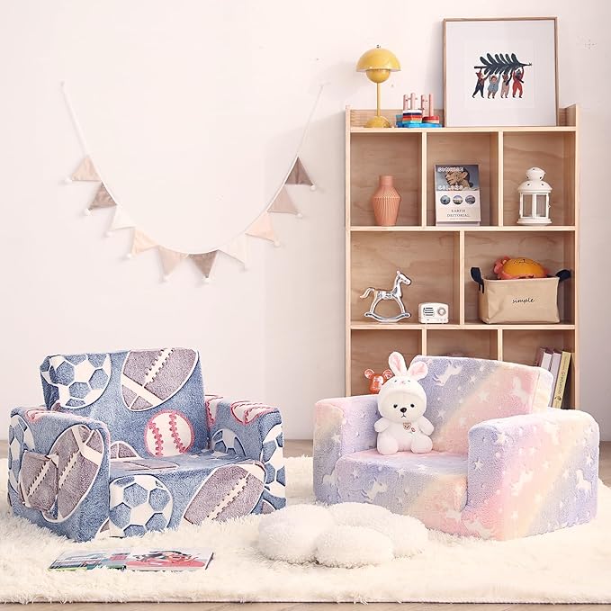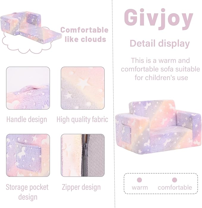- 【Multifunctional 2-in-1 Design Unique Present for 18 months+ Boys and Girls】The 2-in-1 children's sofa couch is a wonderful present for all kids & toddlers on Birthdays, Christmas, or other occasions! Your child will find this small kids' couch a perfect spot for relaxing, reading, playing, or enjoying their favorite TV shows. Meanwhile, with both modern design and fashionable colors, this small couch can fit any room and add great vitality to your house.