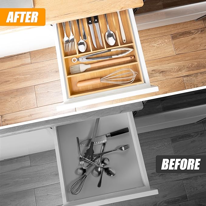 - ✅【Deep Compartments & Reinforced Base】Our utensil drawer organizer features compartments with a depth of 1.9 inches, helping maximize drawer space and perfect for storing more essential tools and gadgets. The utensil silverware drawer organizer flatware cutlery tray comes with a reinforced base, ensuring durability for long-term use, and is ideal for supporting the weight of heavy-duty utensils and knives. Keep everything you need conveniently at hand while cooking, neatly visible, and easy to grasp when preparing the next meal in the kitchen.