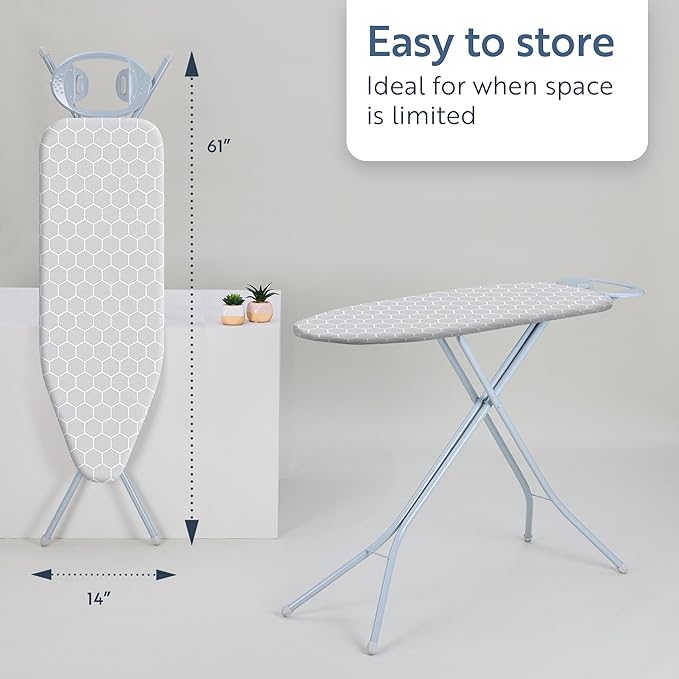 Minky Homecare Classic 4-Leg Ironing Board with Iron Rest - Freestanding Full Size Iron Board for Clothes Pressing with 43" x 14" Surface - Grey Honeycomb