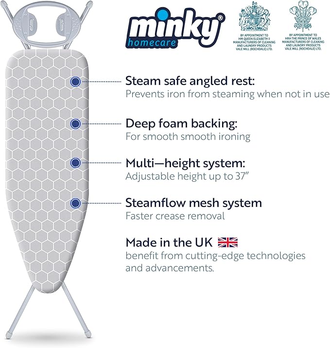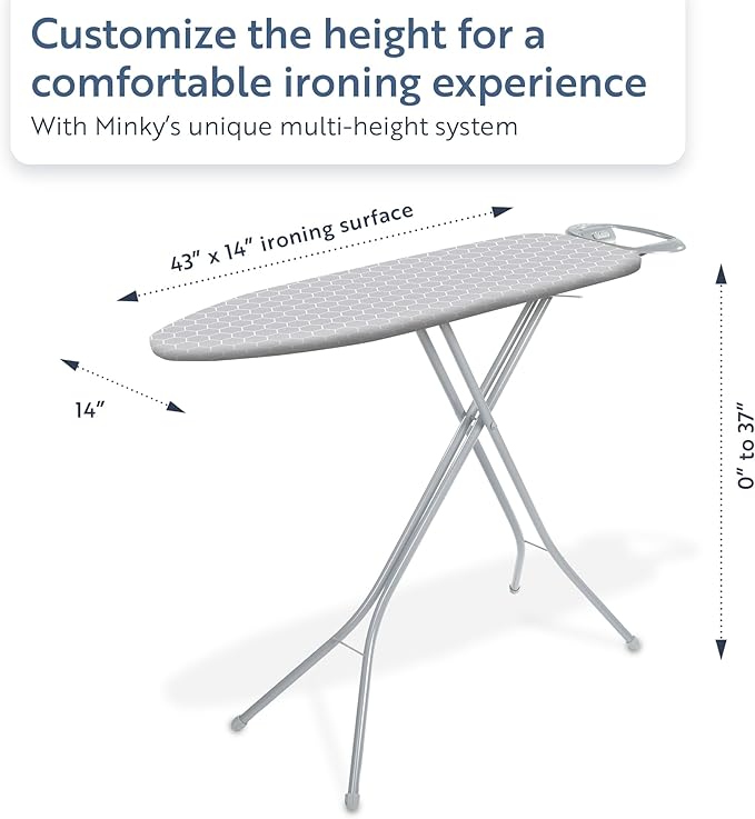 - IRONING SURFACE - Ironing surface is 43” x 14”. Board features infinite height adjustment up to 37". 3 Year Manufacturer’s Warranty.