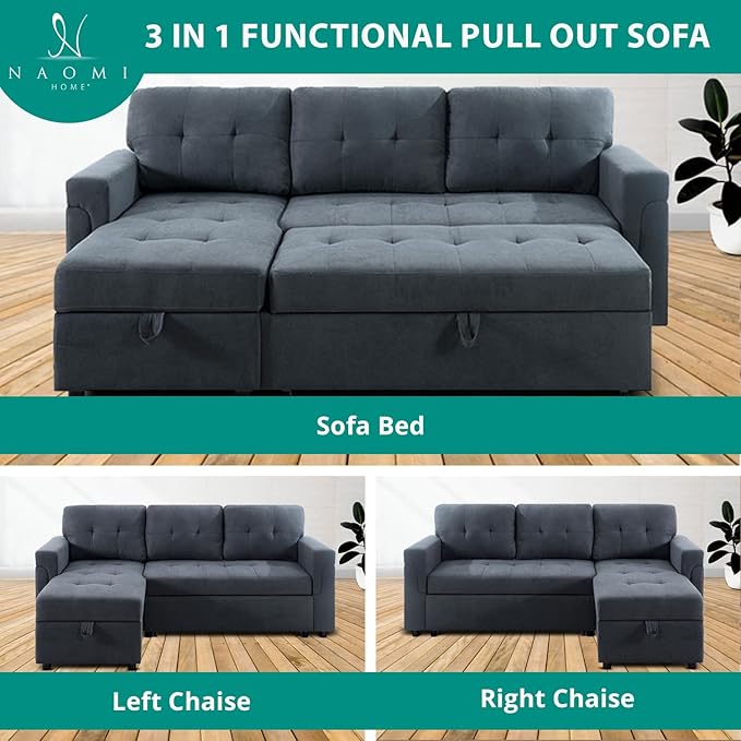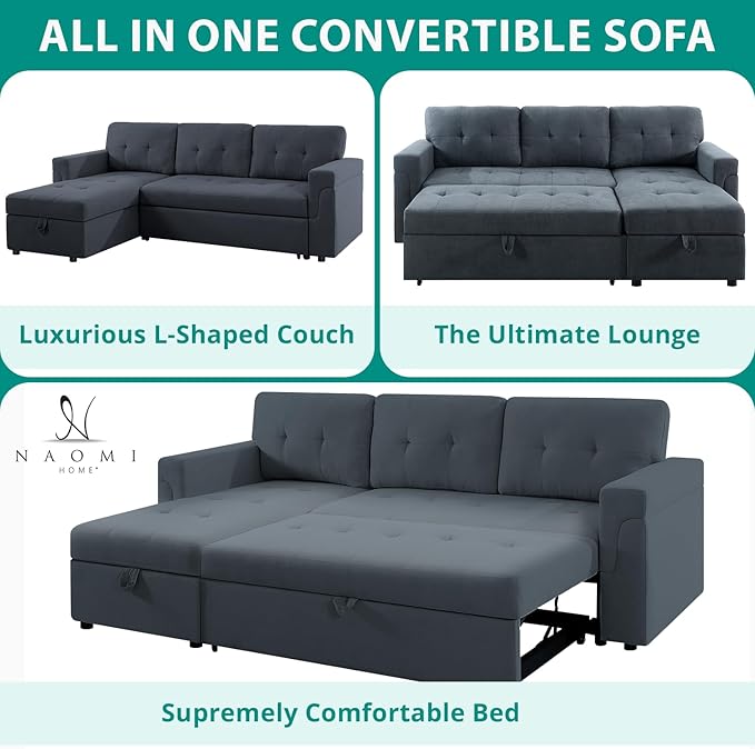 Naomi Home Transform Any Space: Sleeper Sectional Sofa with Convertible Sofa Bed & Inviting Chaise. Find Tranquil Comfort with Stress-Relieving Design & Durable Cushions - Dark Gray/Velvet