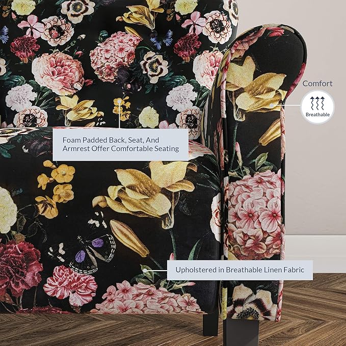 BELLEZE Modern Accent Chair for Living Room, High Back Linen Armchair with Wooden Legs, Upholstered Wingback Side Chair Padded Armrest Single Sofa for Living Room, Bedroom - Allston (Black & Flower)