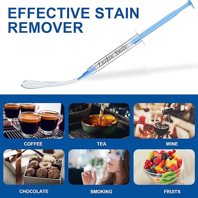 - TEETH WHITENING - LUCKIN SMILE Teeth whitening gel is made with professional grade ingredients (35% Carbamide Peroxide) that are safe to use and will not harm your teeth or enamel, and quickly removes years of accumulated stains from coffee, tea, wine, cigarettes, and more.(Note: trays not included)