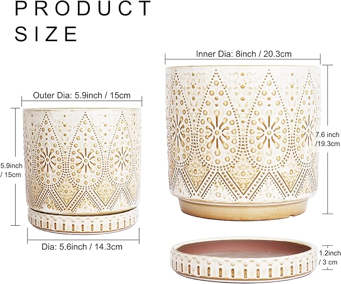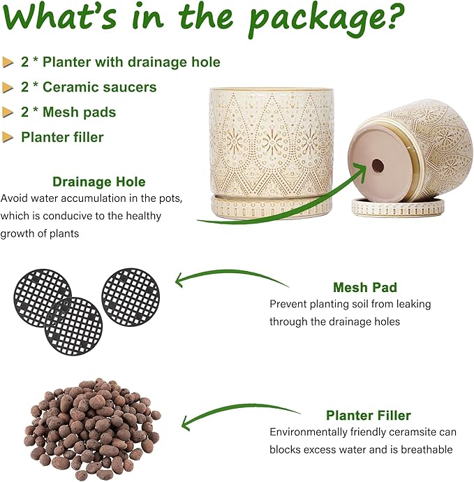 - Size & Package : 8 Inches + 6 Inched plant pot. Package: contains 2 ceramic flower pots, 2 ceramic saucers and 2 mesh pads(NOT INCLUDE PLANTS)