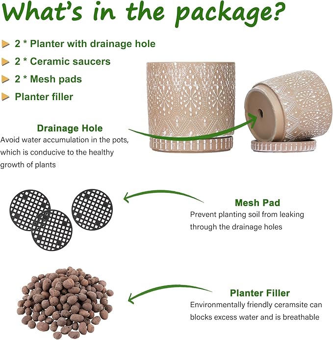 - Size & Package : 8 Inches + 6 Inched plant pot. Package: contains 2 ceramic flower pots, 2 ceramic saucers and 2 mesh pads(NOT INCLUDE PLANTS)