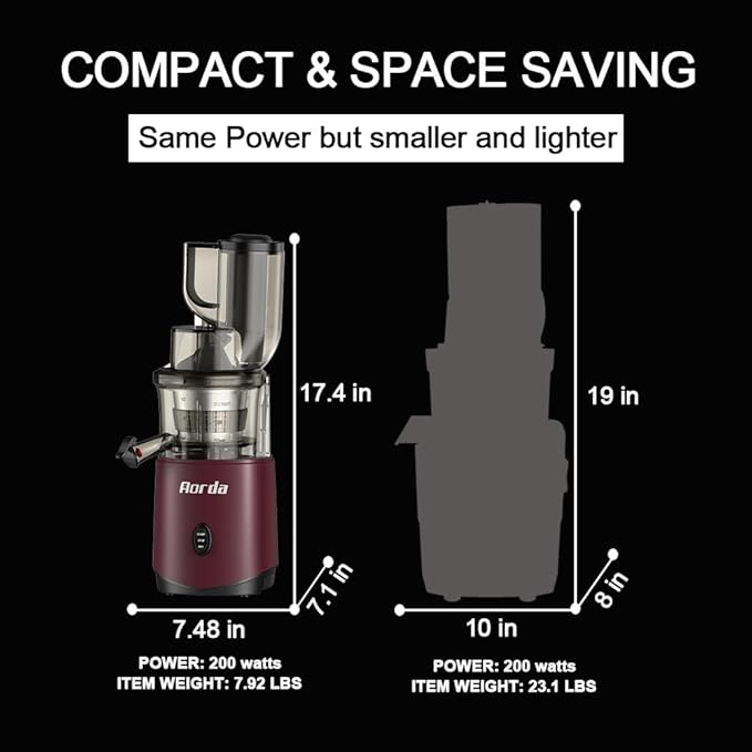- Compact & Space-Saving Design: The Aorda slow juicer cold press boast a sleek, compact design making it ideal for small kitchens or those with limited counter space.With dual inlets (Γ76+45MM), this slow juicer machines can accommodates whole vegetable and fruit, reducing prep time and making juicing more convenient. Store it easily and bring it out whenever you crave fresh, homemade juice