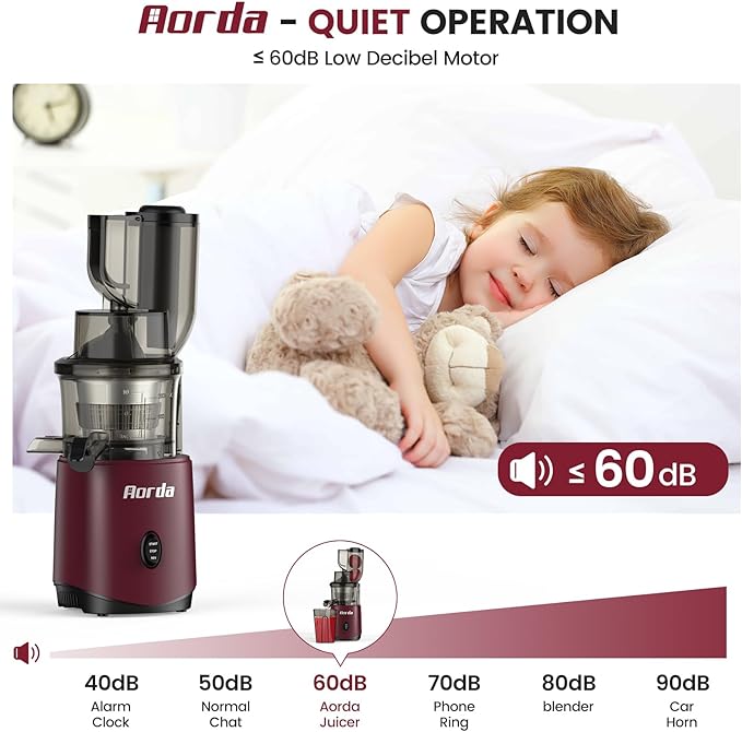 - Quiet Yet Powerful Operation: Experience unmatched juicing efficiency with our slow masticating juicer. It integrates anti-clogging technology and a robust 200W motor, ensures continuous, smooth operation, increase juice yield and decrease waste, making every drop count. It operates at a whisper-quiet 65dB, allowing you to make early morning juices without disturbing the peace of your home