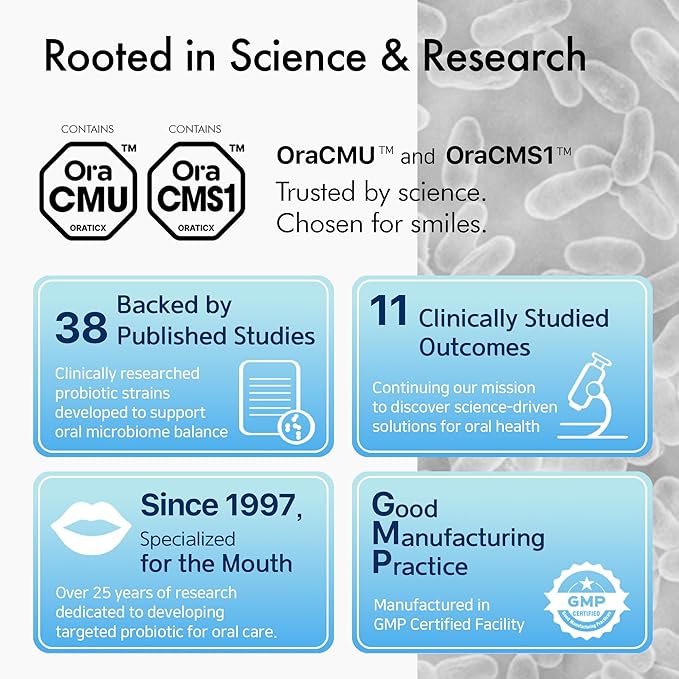 - PREMIUM INGREDIENTS FOR OPTIMAL ORAL HEALTH: Features the scientifically backed and clinically researched probiotics, OraCMU and OraCMS1, specially formulated to enhance oral care and hygiene.