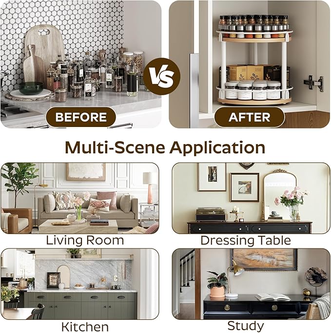 - Reduce Countertop Pressure: It is multifunctional. On the kitchen countertop, it keeps spice jars close at hand to make cooking fun. On the vanity table, it holds your beloved pieces. At the dinner table, you can easily "spin" to get your favorite