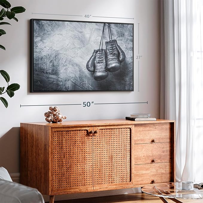 ElephantStock Boxing Gloves Wall Art - Horizontal Framed Canvas - 1-Piece Living Room Wall Decor - Photography Sports Canvas Print - Black and Gray Decor for Wall - 40" X 27"