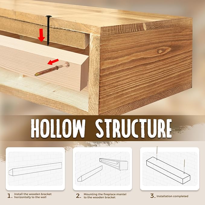 - Easy Installation: Our solid wood mantels come with hidden wood brackets, which can be easily fixed to the wall. Our hollow structure design ensures easy installation. The package includes installation instructions and two sets of accessories, compatible with hollow walls (drywalls) and solid walls (brick walls). For any installation issues, feel free to contact us at any time